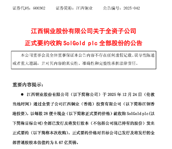 12月25日早间,江西铜业公告称,公司于2025年12月24日(伦敦当地时间)通过全资子公司江西铜业(香港)投资有限公司(以下简称江铜香港投资),以每股28便士现金(以下简称正式要约价格)就收购SolGold plc全部已发行及将发行股本(不包括公司现已持有的股份)发出正式要约(以下简称本次收购)。公告称,正式要约价格对目标公司已发行及将发行的全部普通股股本估值约为8.67亿英镑(约82亿元人民币)。