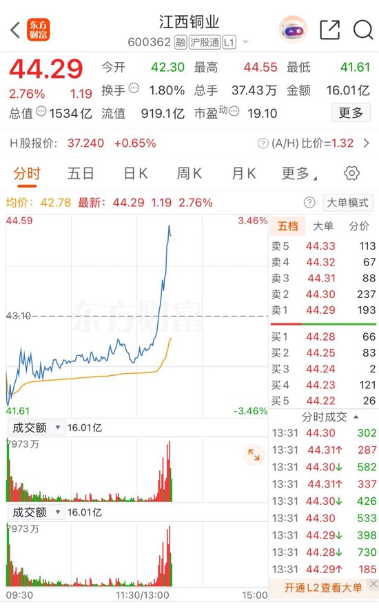 午后,江西铜业快速拉升翻红,截至发稿涨2.76%。