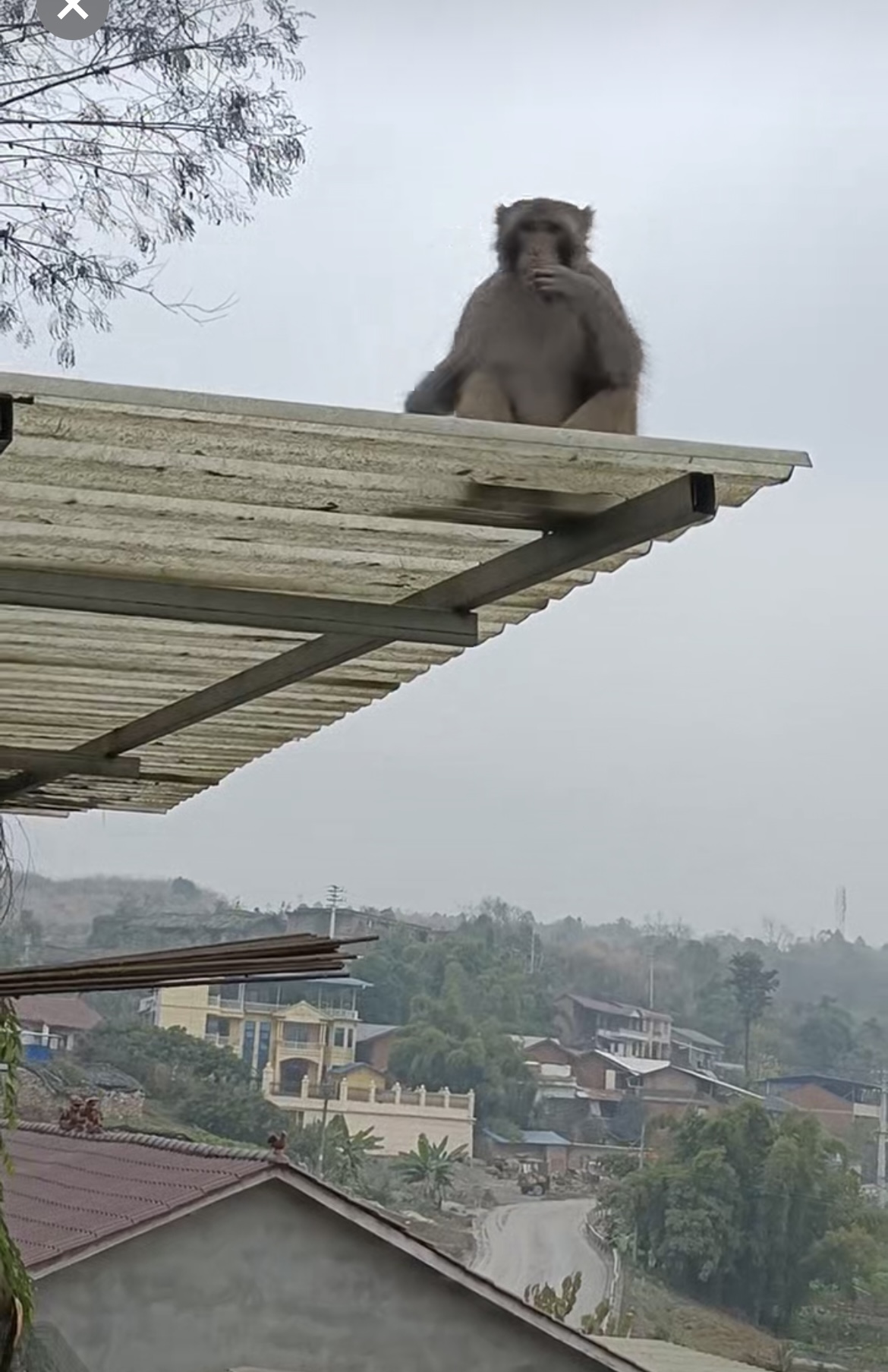 随后,猴哥的身影现身隔壁的高山镇马塘村,骑在村民院子墙上观望。后来又出现在清水寺村,在村里的光缆线上行走。在村民们拍下的视频、照片中,这只猴哥还在村民的院子里溜达,坐在雨棚上啃食花生,在山坡上眺望休憩。